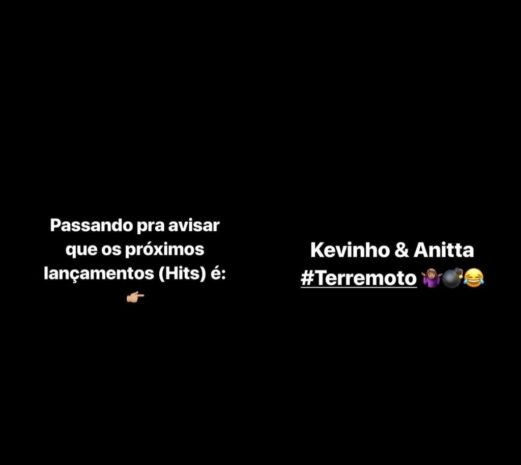 Não falta muito para sair a música do Kevinho e da Anitta juntos! Os dois começaram a falar bastante sobre o assunto publicamente e o funkeiro até revelou o título do single: “Terremoto”. O nome foi postado por ele no Instagram Stories (imagem abaixo). Mais detalhes sobre a música não foram divulgados. Anitta e Kevinho só se referem a ela como “um hit” (um sucesso) – antes mesmo de lançarem.