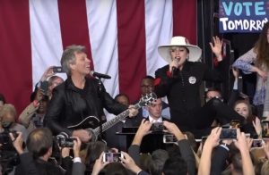 Em evento decisivo das eleições, realizado no estado da Carolina do Norte, Clinton em seu comício a participação dos dois cantores. Gaga e Bon Jovi fizeram um dueto da icônica “Livin’ On A Prayer”, gravada originalmente nos anos 80 pela banda do cantor.