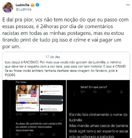 Os fãs de Ludmilla também defenderam a cantora na rede social. “Isso já acontece há anos, não dá para fechar os olhos e fingir que não existe”, afirmou uma das seguidoras. “Certíssima, internet não é terra sem lei”, reforçou outra.