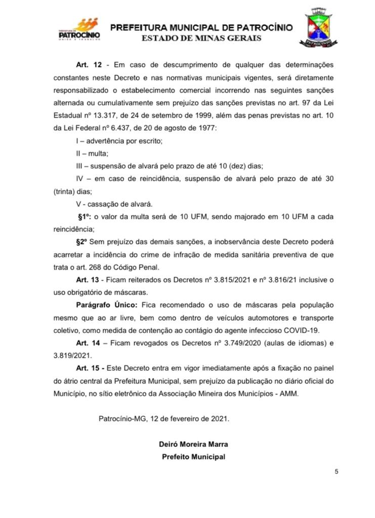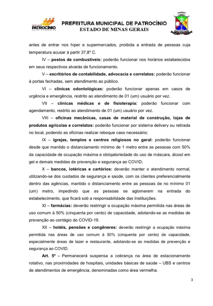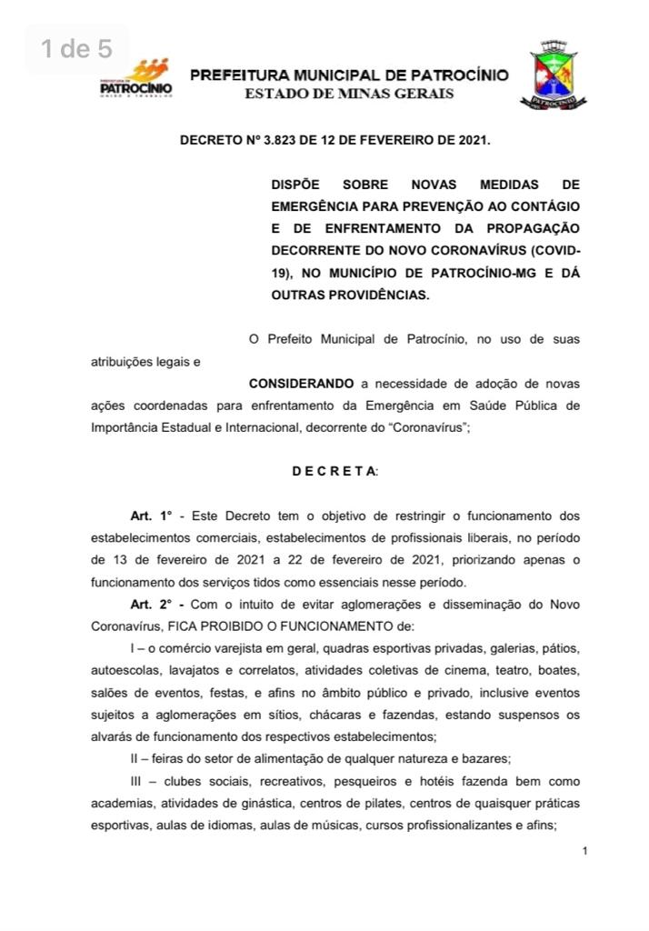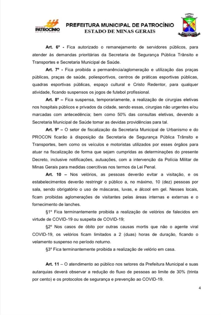 Na tarde desta quarta-feira (12), em virtude do alto número de casos de Covid-19, bem como a grande ocupação de leitos hospitalares no município, um novo decreto foi publicado pela Prefeitura de Patrocínio, de modo a restringir a proliferação do vírus.