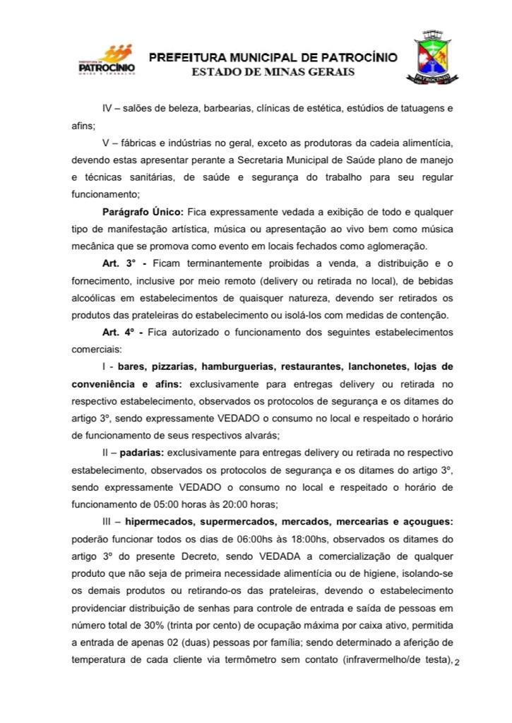 Novo decreto limita comércio e proíbe venda de bebida alcoólica em Patrocínio
