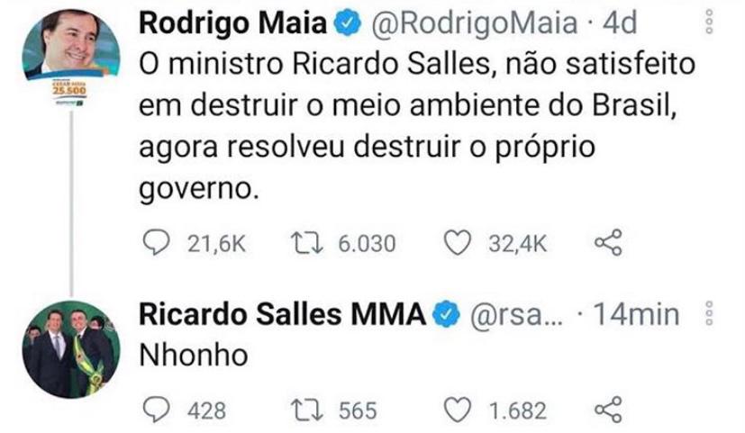Após uma crítica do presidente da Câmara dos Deputados Rodrigo Maia, a conta do Ministro do Meio Ambiente, Ricardo Salles, no Twitter retrucou: “Nonho”.