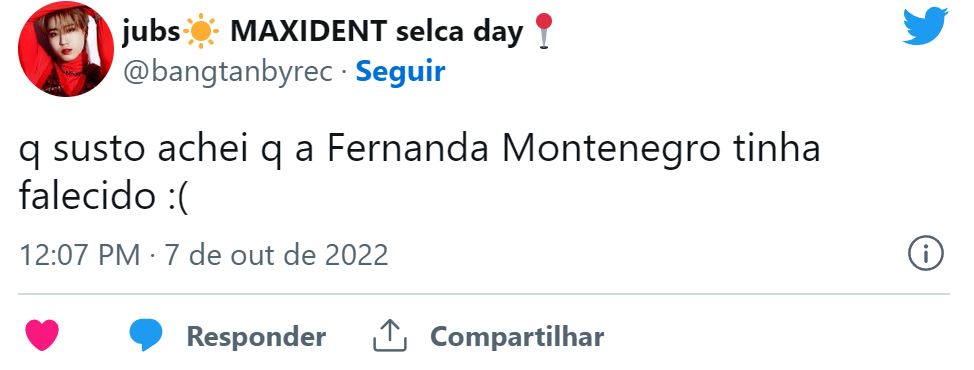 O nome da atriz Fernanda Montenegro está em alta no Twitter, após os usuários da rede social viralizarem um post afirmando que a mesma deveria “descansar em paz”. Na postagem, um usuário diz que a atriz será substituída por Jade Picon.